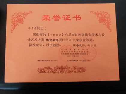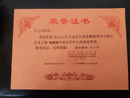 2017年荣获《论激光技术、气动抛光技术在陶瓷成型中应用》论文壹等奖,瓷板雕刻《宁静致远》壹等奖,玲珑陶瓷《玲珑壶》壹等奖等。